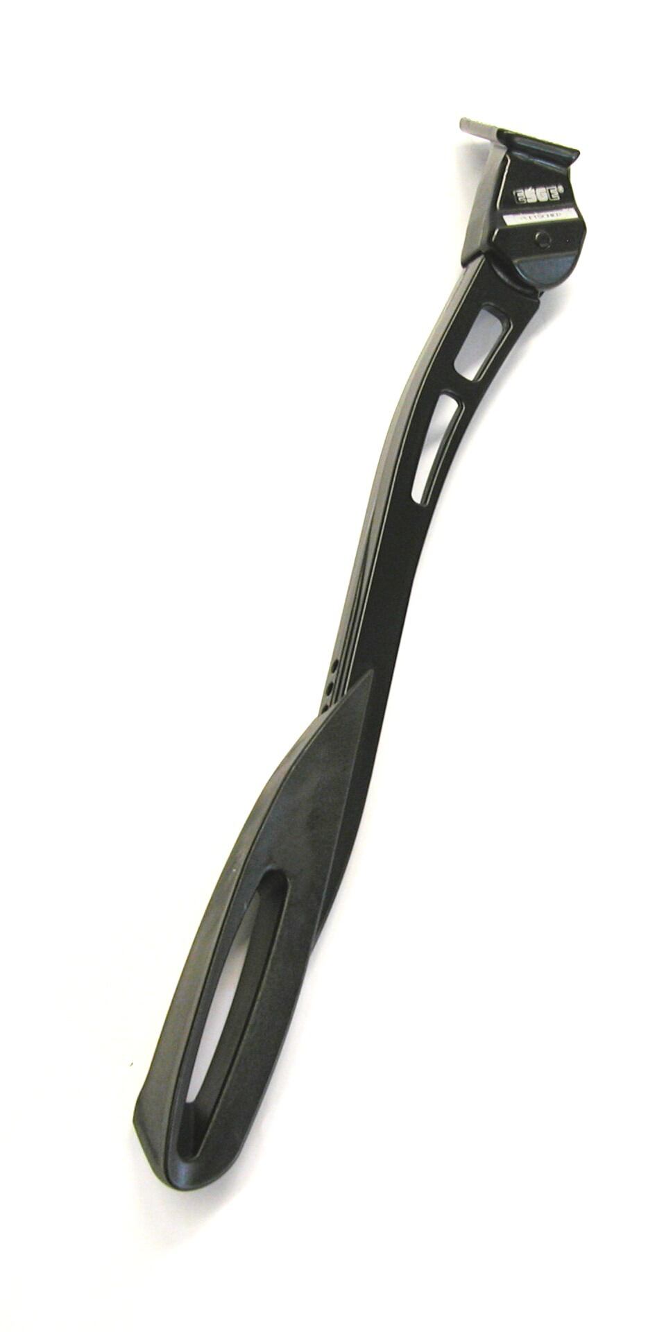 世界有数の自転車ショー、ユーロバイクで「EUROBIKE AWARD」を受賞したファッショナブルセンタースタンド。 ESGE(エスゲ)は、メイド・イン・スイスの高品質なスタンドをリリースするPLETSCHER社のスタンドに冠されたブランド。この『ズーム』は曲線と穴あけを組み合わせた優美なデザインでハイグレードバイクになじみ、あなたの愛車の魅力を効果的に引き立てるアクセサリーになります。 脚部は調整可能で、24~28インチ車に対応。ボトムブラケット位置の高いスポーツ用小径車なら、24インチ未満でも装着できるものもあります。弊社テストでは20インチ車でも取付けできるものがありました(画像参照)。 標準添付の傘型プレートにより多くの車種に対応しますが、オプションのU型プレートの追加や、菱形プレートとの交換も可能です。オプションの20mmボルトを使用すれば、センタースタンド用台座のある自転車にも装着できます。