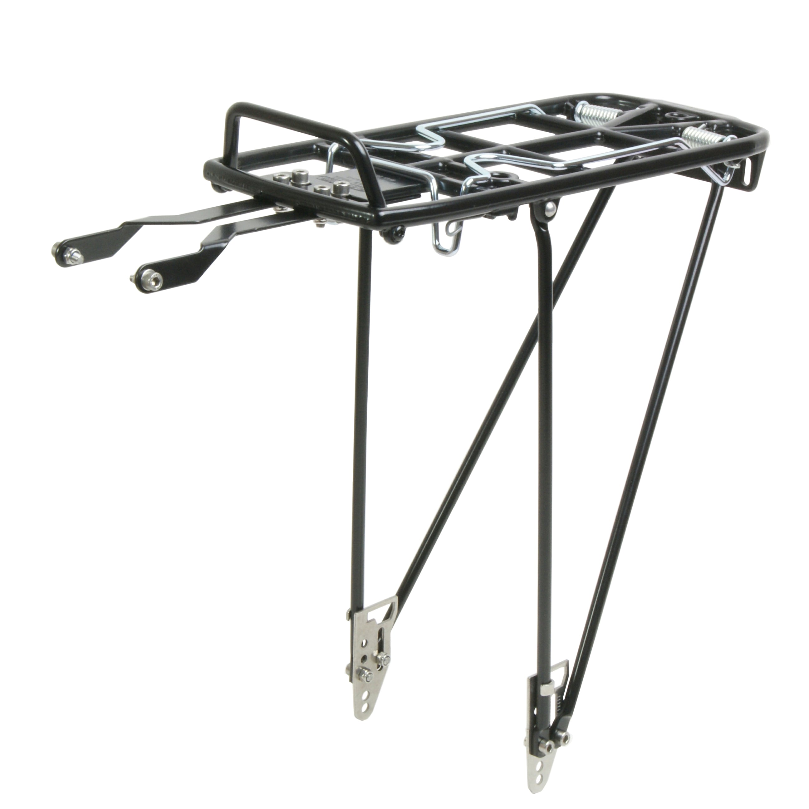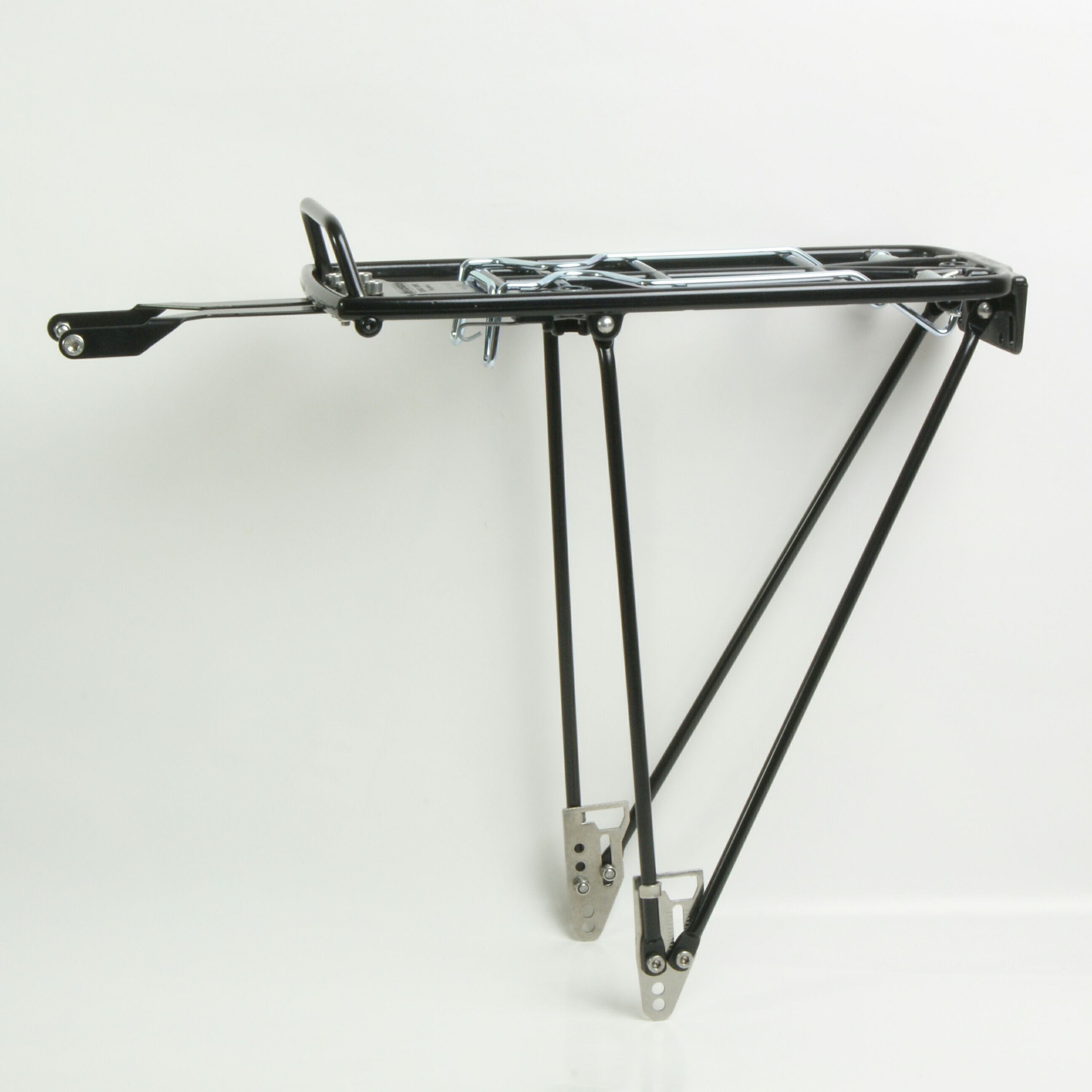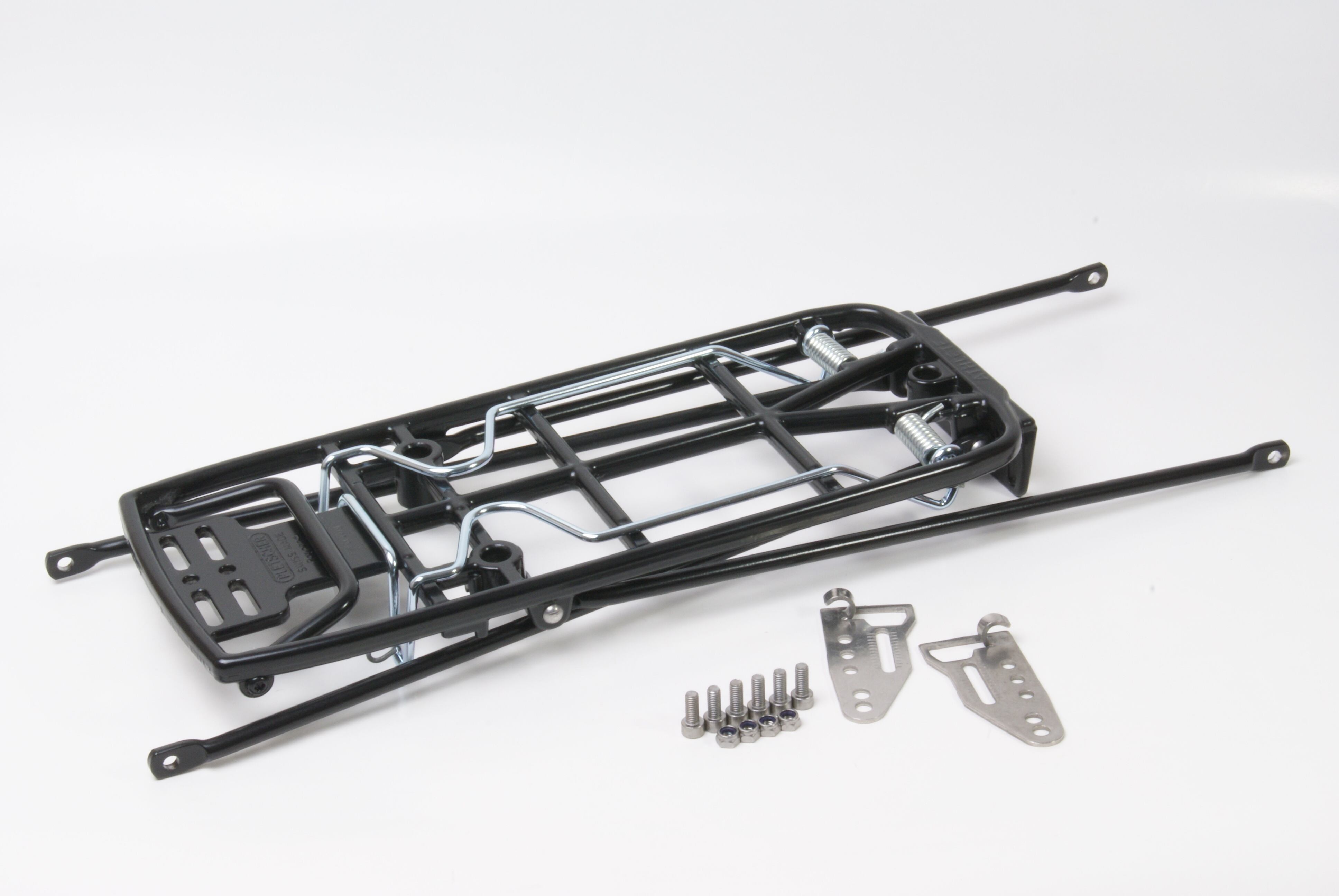スタンドとしての基本性能が充実しており、830gの軽量キャリアでありながら耐荷重25kgのタフ仕様。本体はアルミ合金製で、車体取付用ステーやエンドプレートはステンレス製。いずれも錆びにくい素材です。エンドプレートやステーは装着位置を調整できるので、幅広いサイズ、車種に適合します。オプションのディスクブレーキ用エンドプレートを使用すれば、ディスクブレーキ搭載車にも装着可能です。