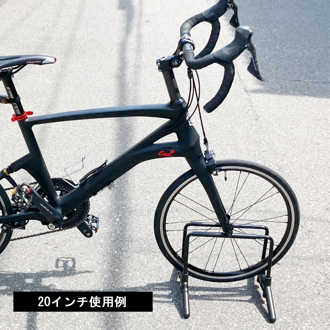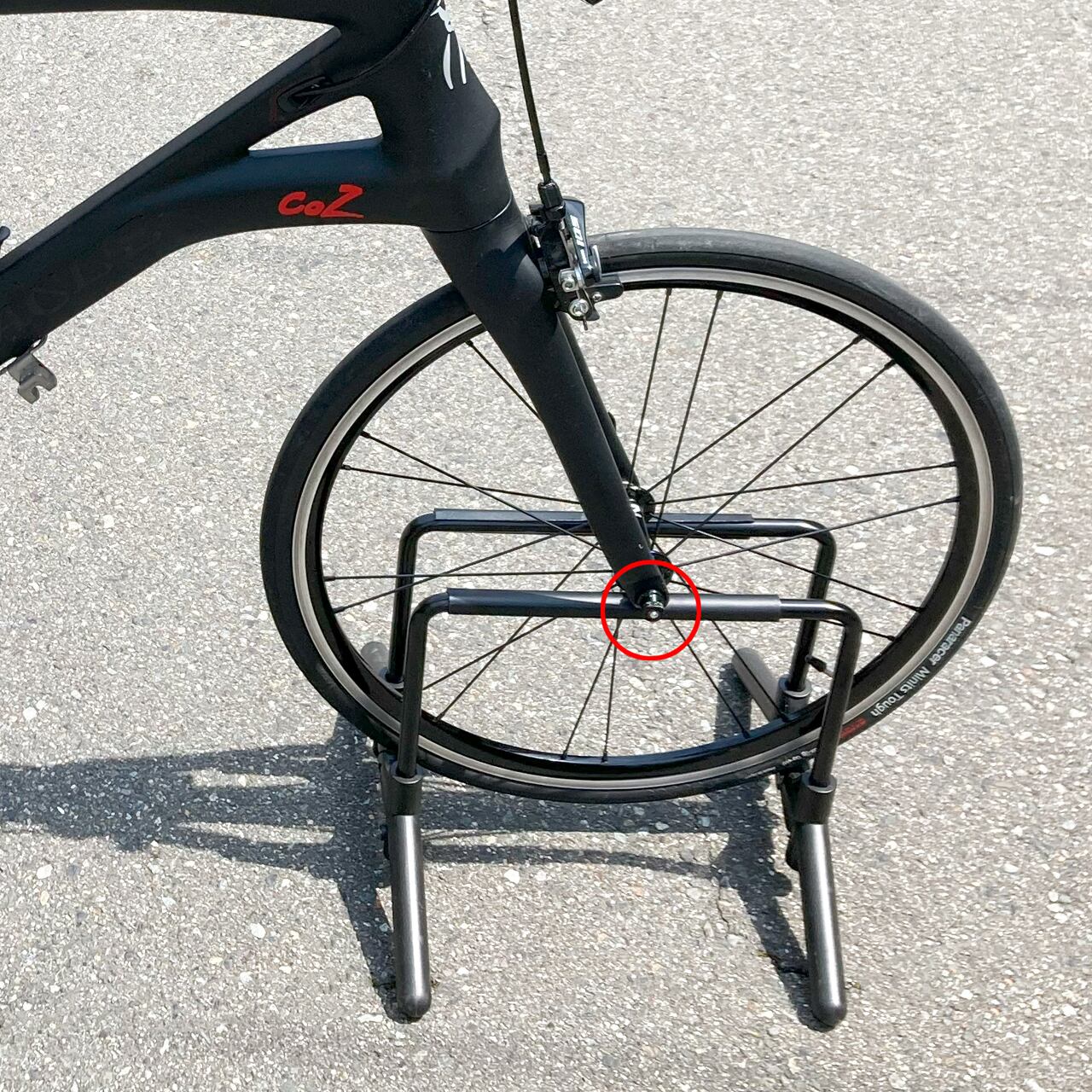 安定性を高めるため前後輪が一直線になる様に自転車を置いてください(前輪で固定する場合)。