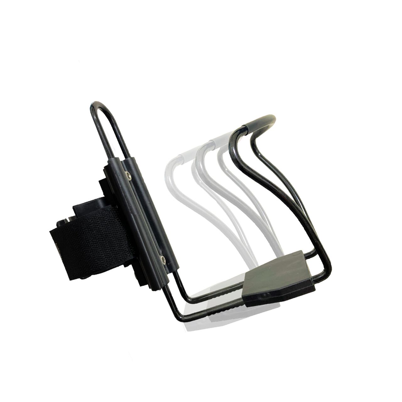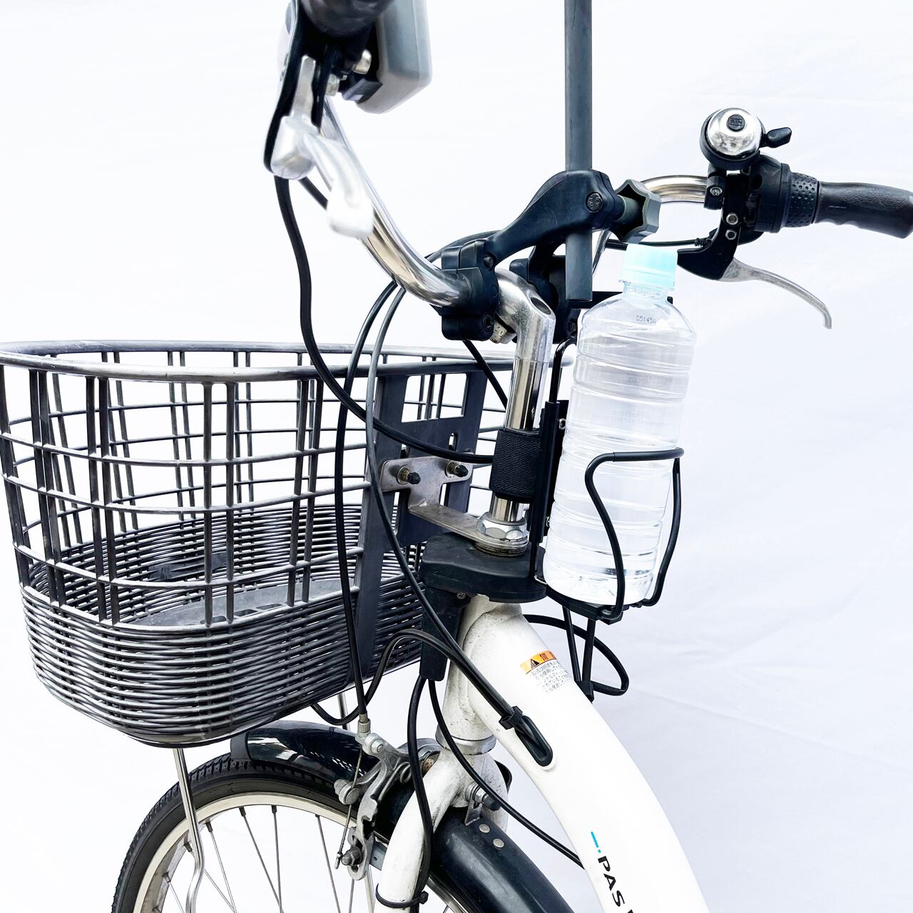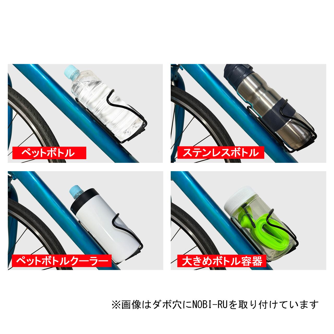 ダボ穴(取付け穴)のないシティサイクルやママチャリ、自転車に限らずパイプ状のものにならどこにでも取付ることができる「どこでもケージホルダー」と「サイズ調整式ボトルホルダーNOBI-RU(のびーる)」のセット。