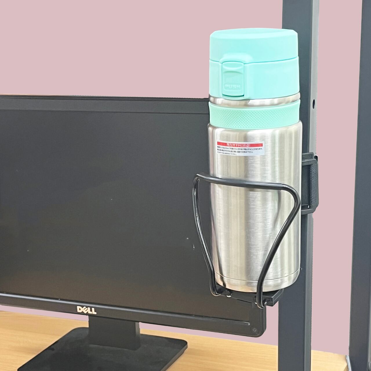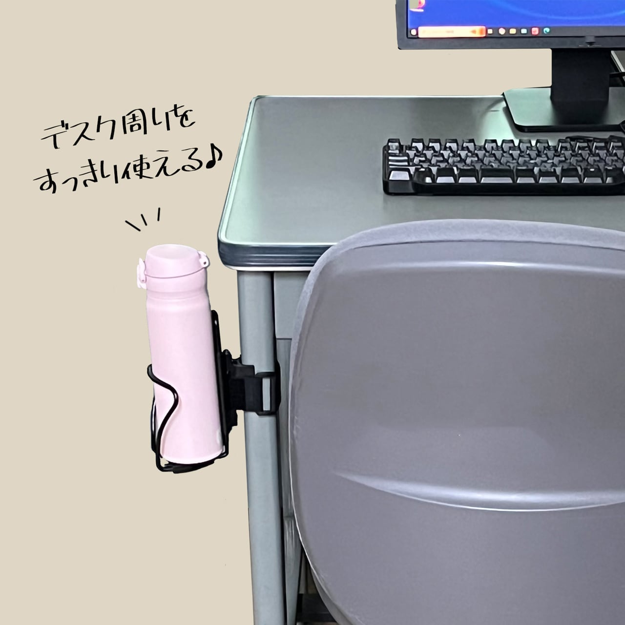 パソコンラックやデスクの脚に取り付けてデスク周りをスッキリ!また、パイプ椅子に取り付けると集会などで机がない時にでも水分補給がスムーズにできます。他に工場作業内やエアロバイクなど様々なところでご使用いただけます♪