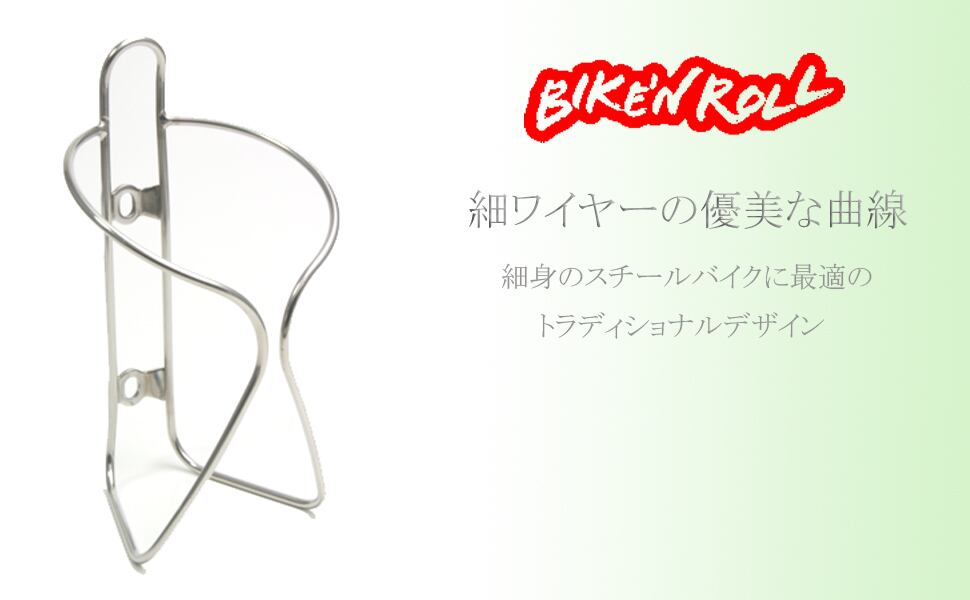 このボトルケージは細身のステンレスワイヤーを曲げて作られた、ハンドメイド製品。シルバーに輝くトラディショナルなスタイルは、細身の自転車にもぴったりです。ステンレス製ですから錆びることはなく、細身ながらも充分な強度を備えています。